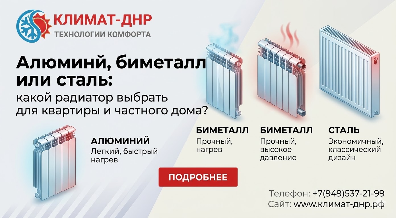 Инженеры «Климат-ДНР» предупреждают: ошибка в выборе металла может стоить вам не только холодной зимы, но и сотен тысяч рублей на ремонт затопленных соседей снизу. Главное правило, которое нужно усвоить до похода в магазин: выбор радиатора зависит исключительно от типа вашей системы отопления (квартира это или частный дом).