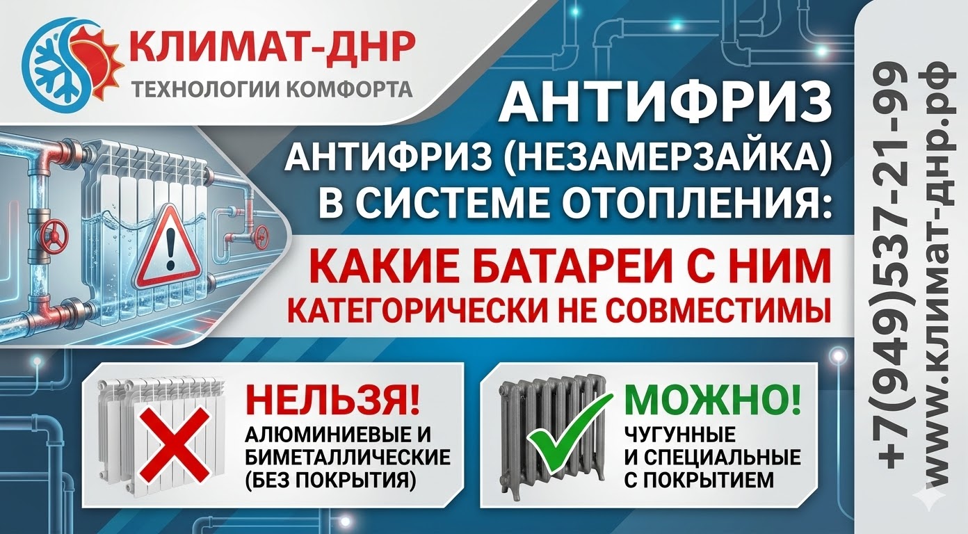 Чтобы этого избежать, владельцы автономного отопления заливают в систему специальный теплоноситель — антифриз (незамерзайку). Но инженеры «Климат-ДНР» предупреждают: этот химический коктейль не прощает ошибок. Если вы зальете его в неподходящие батареи, весной ваш дом превратится в химическое болото.
