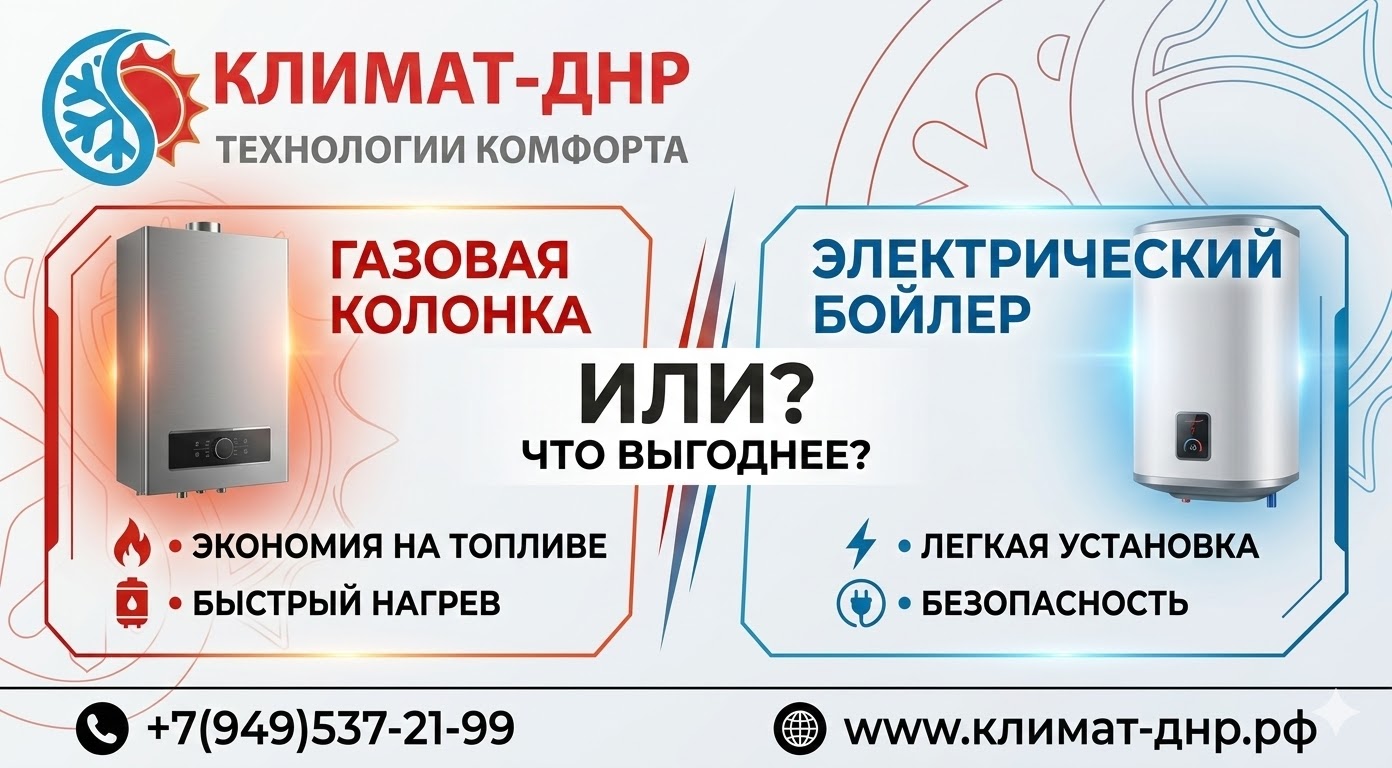 Что окажется дешевле в долгосрочной перспективе? Что безопаснее и надежнее в условиях нашего водопровода? Инженеры компании Климат-ДНР подготовили объективное сравнение газовых колонок и электрических накопительных бойлеров, чтобы вы могли принять взвешенное решение.