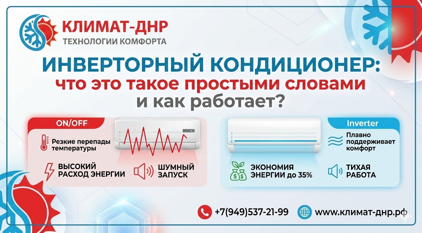 Что такое инвертор? Это маркетинговая уловка, чтобы заставить вас заплатить больше, или реальная технология, меняющая правила игры? Инженеры «КЛИМАТ-ДНР» объясняют суть этой сложной технологии самыми простыми словами.