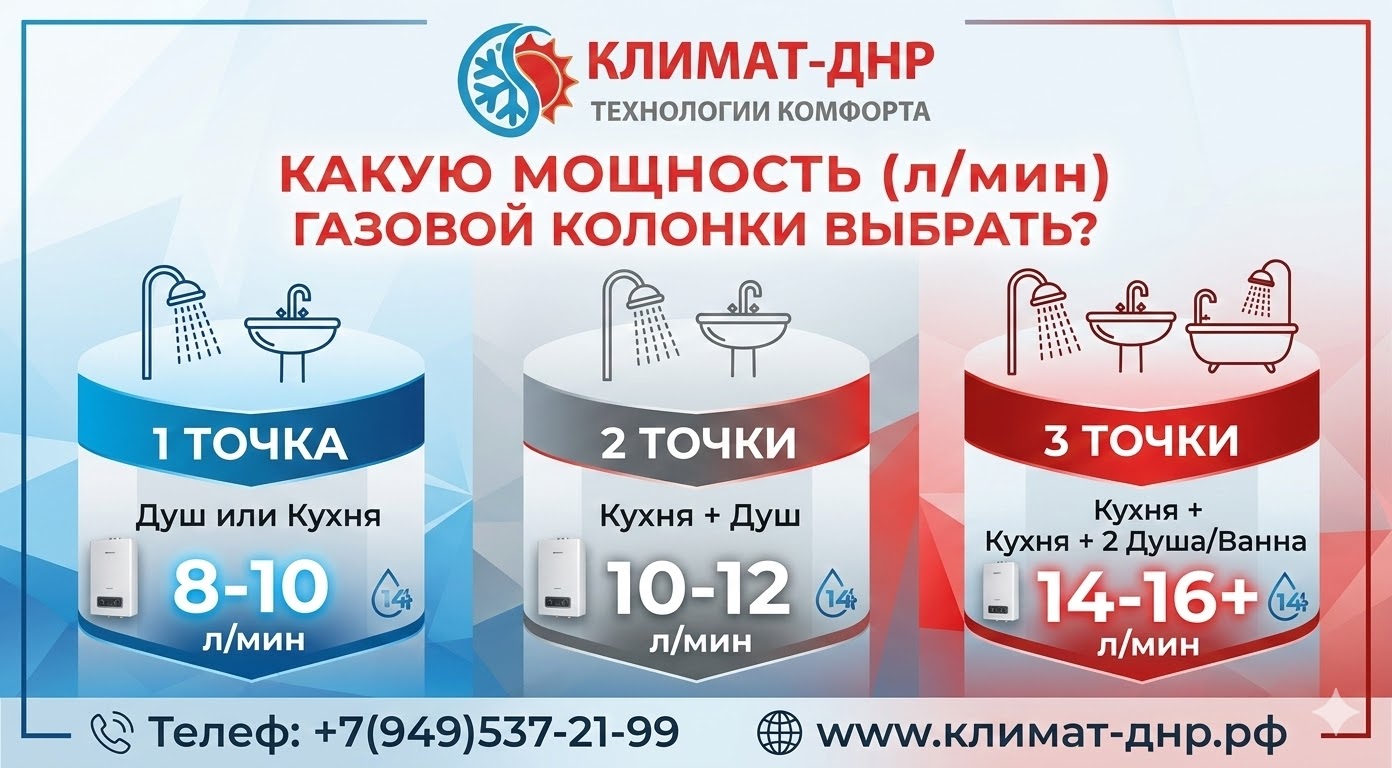 Инженеры компании Климат-ДНР ежедневно сталкиваются с последствиями неправильного выбора оборудования. Давайте разберем самый важный параметр проточного водонагревателя — его производительность — и научимся подбирать колонку строго под ваши потребности.