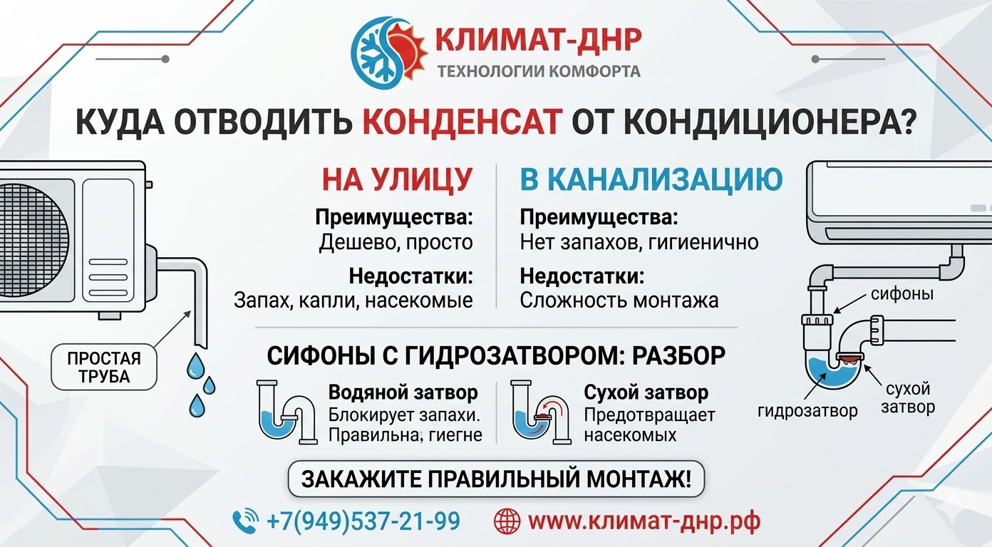 Кондиционер — это мощный вентилятор. Если дренажный шланг просто воткнуть в канализационную трубу, турбина кондиционера начнет засасывать воздух из канализации прямо в вашу спальню или гостиную. Вонь будет стоять невыносимая, а дышать испарениями септика — опасно для здоровья. Подключение должно идти СТРОГО через специальный сифон!