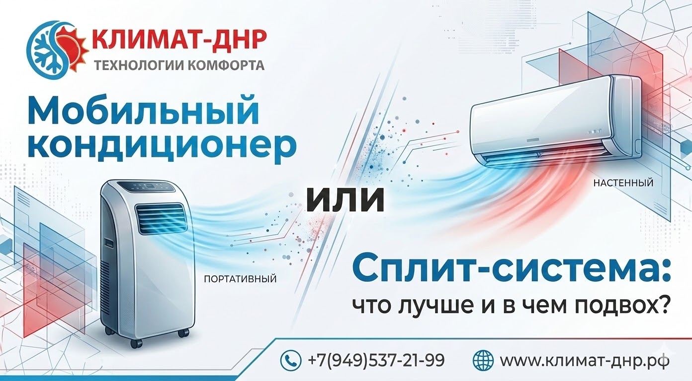 Кажется, что мобильный кондиционер — это идеальное решение без сверления стен и пыли. Но инженеры «КЛИМАТ-ДНР» предупреждают: в этой бочке меда есть огромная ложка дегтя. Разбираем обе технологии честно и без маркетинговых уловок.