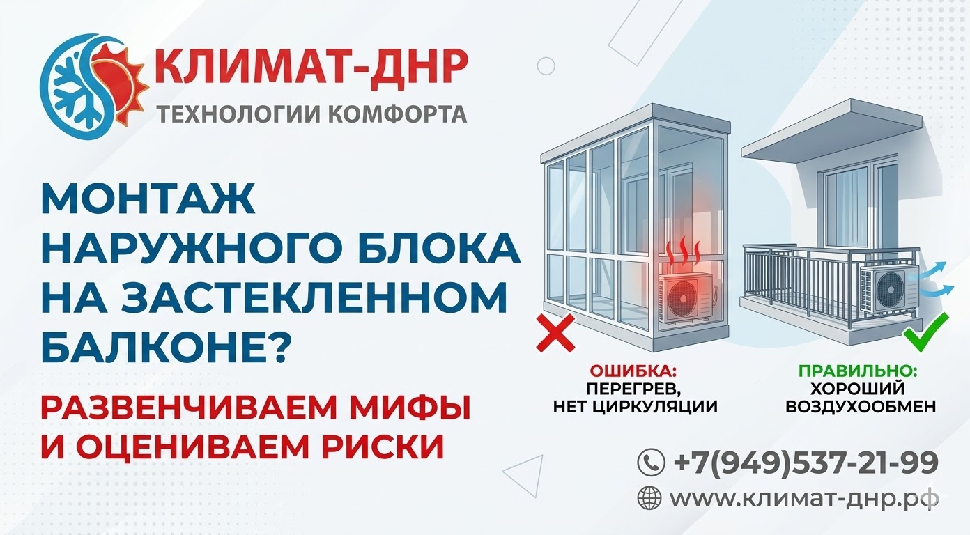 Каждый сезон инженеры «Климат-ДНР» слышат от клиентов одну и ту же просьбу: «А давайте повесим наружный блок кондиционера прямо внутри моего застекленного балкона! Ему там будет сухо, дождь не намочит, хулиганы не достанут, да и за автовышку платить не придется».