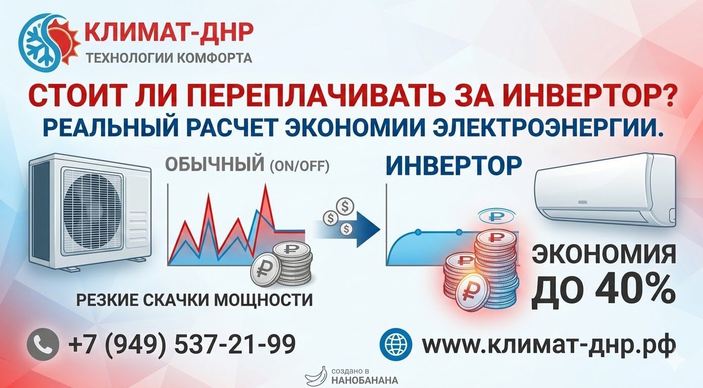 Разница в цене существенная — 8 000 рублей. Возникает логичный вопрос: а сможет ли эта экономия на счетах за свет отбить переплату? Инженеры «КЛИМАТ-ДНР» отложили рекламные буклеты в сторону, взяли калькулятор и провели реальный расчет.