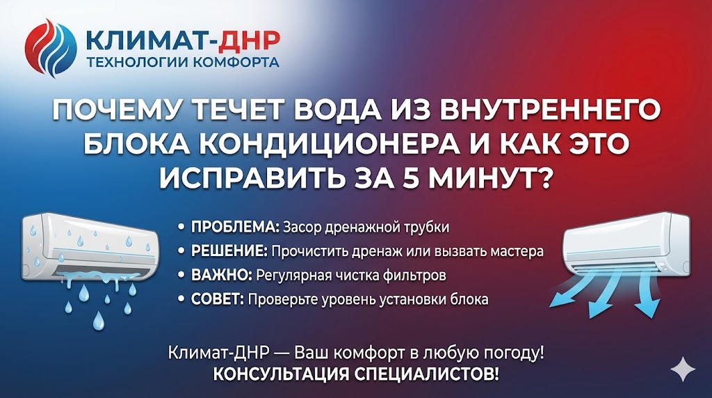 Если после прочистки трубки вода всё равно капает — проблема может быть в микротрещине пластикового поддона или в поломке дренажной помпы (в кассетных или канальных моделях). В этом случае не стоит рисковать электроникой — лучше вызвать профессиональный сервис «КЛИМАТ-ДНР».