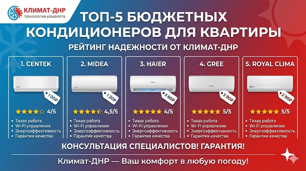 Выбор недорогой сплит-системы — это всегда риск наткнуться на шумный пластик или компрессор, который выйдет из строя через два сезона. Мы в «КЛИМАТ-ДНР» отобрали 5 брендов-гигантов, чьи бюджетные линейки собираются на передовых заводах. Если ваша цель — выгодно купить кондиционер в ДНР, этот рейтинг сэкономит ваше время и деньги.