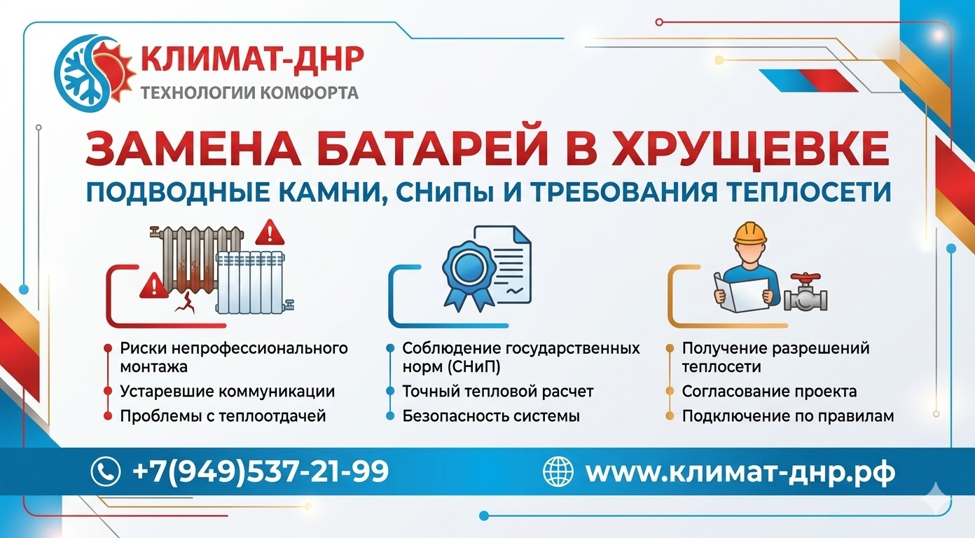 Однако система отопления в хрущевках, сталинках и брежневках спроектирована по строгим советским ГОСТам. Любое самовольное вмешательство в этот механизм может оставить без тепла весь подъезд, а вам принести огромные штрафы от теплосети. Инженеры «Климат-ДНР» разбирают 3 главных подводных камня при замене батарей в старом фонде.