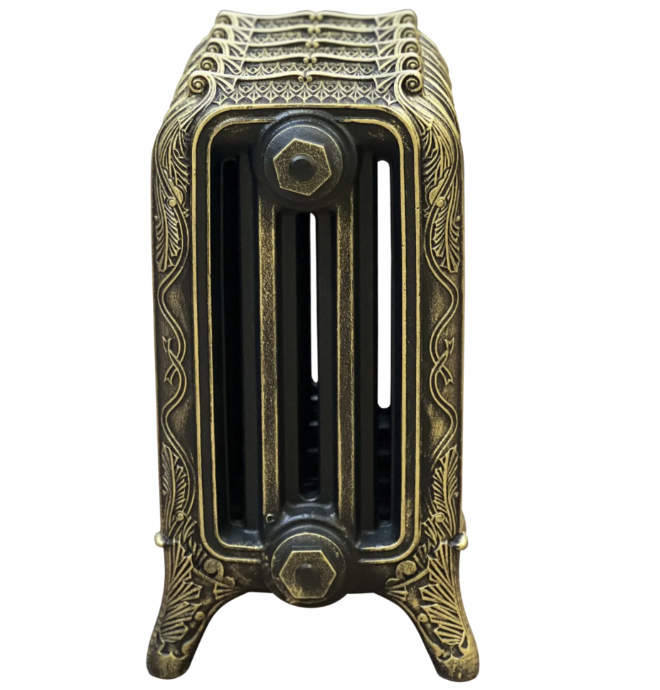 Линия Iris — это благородный рельеф с тонким флористическим мотивом, аккуратно подчеркнутый плавными ребрами. Компактный формат 350 органично смотрится под низкими подоконниками, в нишах и на узких стенах, не перегружает пространство и при этом остается выразительным акцентом. Такой чугунный радиатор уместен в ретро-интерьерах, неоклассике, лофте и арт-деко, помогает связать мебель, отделку и свет в цельную композицию.