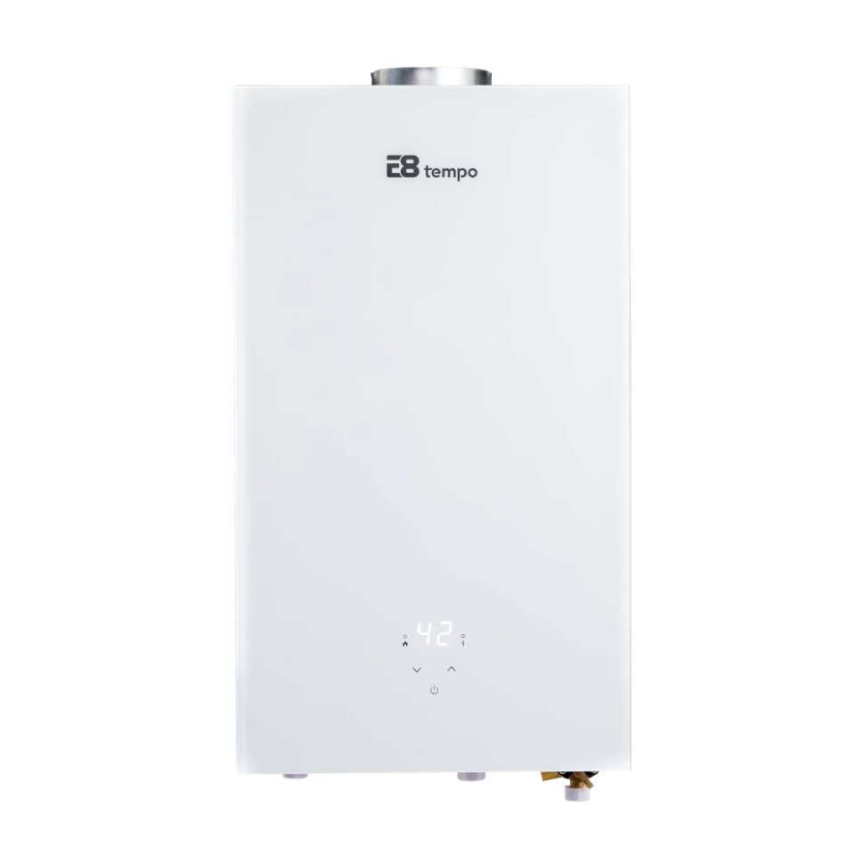 Проточный газовый водонагреватель E8 tempo E8WAY24 (белая стеклянная панель)